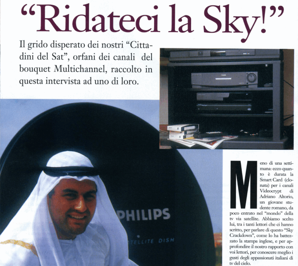 Meno di una settimana: ecco quanto è durata la Smart Card (clonata) per i canali Videocrypt di Adriano Altorio, un giovane studente romano, da poco entrato nel “mondo” della tv via satellite. Abbiamo scelto lui, tra i tanti lettori che ci hanno scritto, per parlare di questo “Sky Crackdown”, come lo ha battezzato la stampa inglese, e per approfondire il nostro rapporto con voi lettori, per conoscere meglio i gusti degli appassionati italiani di tv del cielo. “La mia avventura con il satellite”, ci racconta Adriano, “è cominciata lo scorso anno. E quando dico che si tratta di un’avventura non scherzo: ci sono voluti cinque mesi per riuscire a vedere il mio impianto di ricezione completo e funzionante. Ho avuto la possibilità di acquistare una serie di apparecchi della Philips, e sul finire dello scorso anno, ho ordinato il mio kit. Purtroppo non tutti i pezzi erano disponibili in magazzino, quindi ho cominciato a ricevere i vari componenti a singhiozzo: a Novembre è arrivata la parabola, una splendida gregoriana da 120 cm. ad alto rendimento. A Dicembre è stata la volta del ricevitore, l’STU 804. E a Gennaio, finalmente, il supporto per la parabola, giunto direttamente dalla sede olandese della Philips. Attraverso l’amministratore del condominio ho contattato un installatore, e qui sono (ri)cominciate le attese: l’installatore è arrivato (dopo una settimana), ha fatto il sopralluogo, e ha sentenziato che era necessario fare un lavoro in muratura per montare il kit sul tetto dell’edificio in cui vivo. Quindi era necessario riuscire a far coincidere la sua (limitata) disponibilità con quella di un muratore. Vi lascio immaginare quanto fosse facile… Poi si è reso conto che era necessario anche un particolare palo di sostegno, ovviamente di difficile reperibilità (almeno secondo la sua opinione. Quando finalmente sembrava che tutto fosse a posto, il muratore si ferisce con il martello pneumatico: tutto rimandato, di nuovo! A quel punto ho fatto l’unica cosa che era possibile…” Ovvero? “Mi sono rivolto ad un altro installatore! Il signor Poli, per la precisione, che nel giro di una settimana ha fatto il sopralluogo e mi ha installato il tutto, con ottimi risultati.” E siamo arrivati a Maggio: all’impianto si aggiunge un decoder Videocrypt Pace e la fatidica Trick Card per ricevere i canali della Sky…